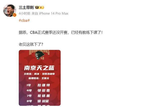 根据媒体人“三土带刺”的消息,同曦队的主教练梅米-贝西洛维奇即将下课,同曦队新任主教练会是谁呢?目前国内的主教练确实不多,难道要把西热力江重新请回来?可能性不大。那么就是继续聘请国外的教练团队,对于南京同曦队这样的球队来说也没有大量的资金去投入这方面。新赛季同曦队没有CBA国内得分王林葳,休赛期也没有进行大规模补强,想要再次进入季后赛的可能几乎为零。