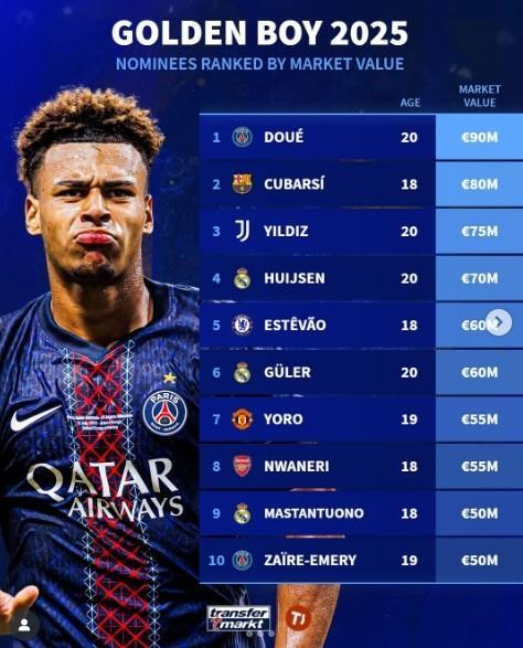 北京时间10月16日,《都灵体育报》公布了2025年金童奖25人候选。在名单公布后,德国转会市场对他们的身价进行了排名。大巴黎球员杜埃以9000万欧的身价高居榜首。
