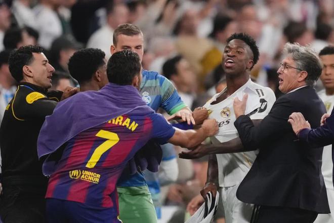 事件起因于比赛末段佩德里的被罚下场。维尼修斯在被换下后情绪激动,重新走出替补席庆祝佩德里染红的判罚,引发巴萨替补席强烈不满。费兰·托雷斯和巴尔德率先冲上前理论,双方爆发冲突。卢宁看到维尼修斯被围上,立刻从皇马替补席冲出保护队友,随后双方推搡、拉扯、混乱一片,最终卢宁成为唯一被出示红牌的球员。