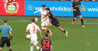 第45+1分钟,马扎倒地铲射破门,勒沃库森5-0海登海姆